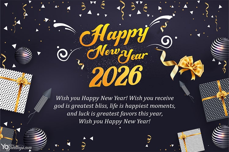 Customize the Happy New Year 2026 greeting card with beautiful ribbon for your friends and loved ones. Let's celebrate the New Year 2026 in a way that everyone remembers for years. By personalizing the Happy New Year 2026 images with wishes names. Online New Year greeting card design for meaningful new year celebration. It's wonderful to have your new year wishes sent to your loved ones through the best 2026 New Year greeting card photo maker effect from Yogreetings.