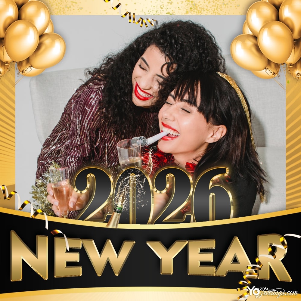 Customize happy new year 2026 photo frames with luxurious gold frames for anyone. New Year 2026 photo frames can help you create colorful and trendy party pictures with our New Year 2026 frame designs from balloons and golden ribbons. Send New Year 2026 greetings in a special way with custom photo frames. Share it if you find it interesting.